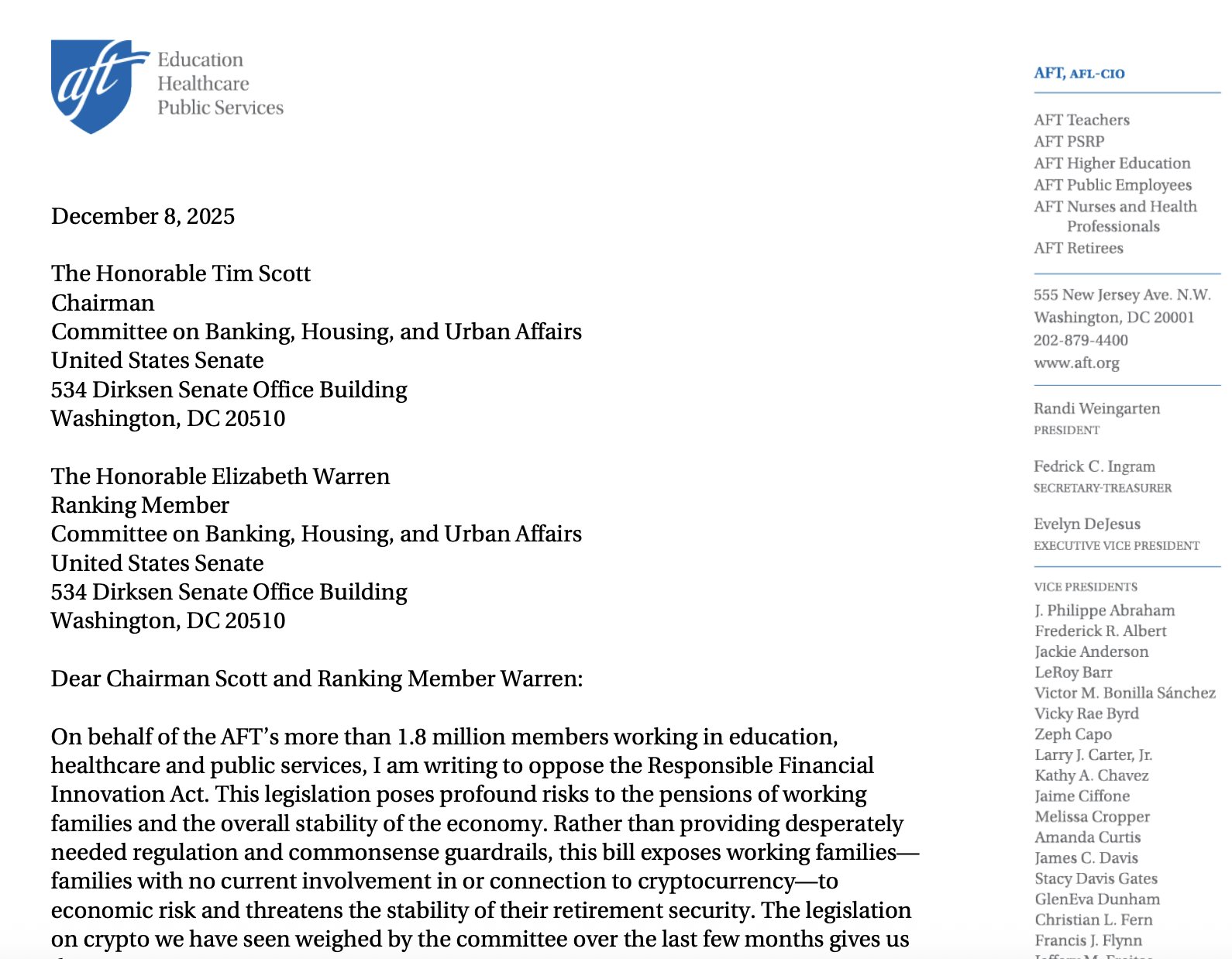 The CLARITY Act, a July draft from the Senate Banking Committee, and a November draft from the Senate Agriculture Committee did not specifically authorize digital assets for use in pensions or retirement funds. Nonetheless, the AFT argued that, if enacted, the legislation could result in pensions and 401(k) plans holding unsafe assets even when investing through traditional securities.