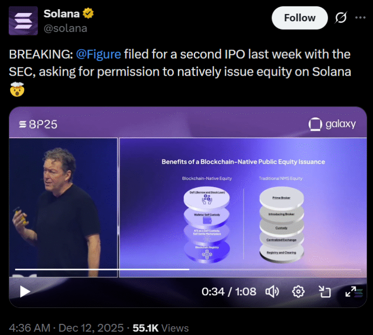 Figure Technology has filed for a second public offering to issue blockchain-native equity on Solana, enabling onchain trading and decentralized finance (DeFi) applications. The plan follows the company’s recent listing on Nasdaq and is intended to expand the range of tokenized securities use cases on Solana.