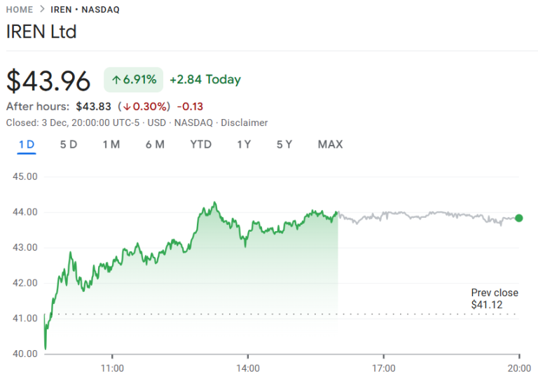 IREN (IREN) climbed as much as 7.6% to an intraday high of $44.25 before closing at $43.96, up 6.9% on the day. The move followed a decline of more than 15% on Tuesday after the company signaled it would pursue a new capital raise.