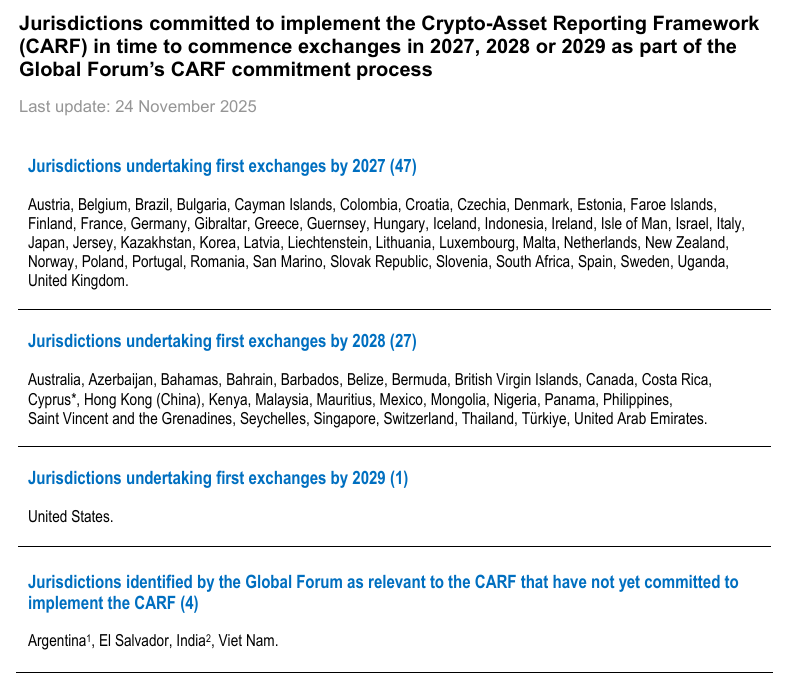 OECD documents list 75 countries, including Switzerland, that plan to implement CARF over the next two to four years. The OECD also notes that Argentina, El Salvador, Vietnam and India have not yet committed to the framework.