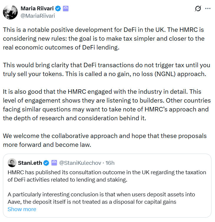 Maria Riivari, a lawyer at DeFi platform Aave, said the change would clarify that DeFi activity does not create a tax event until tokens are actually sold. She added that other jurisdictions with similar questions may look to HMRC’s approach and the work underpinning it.